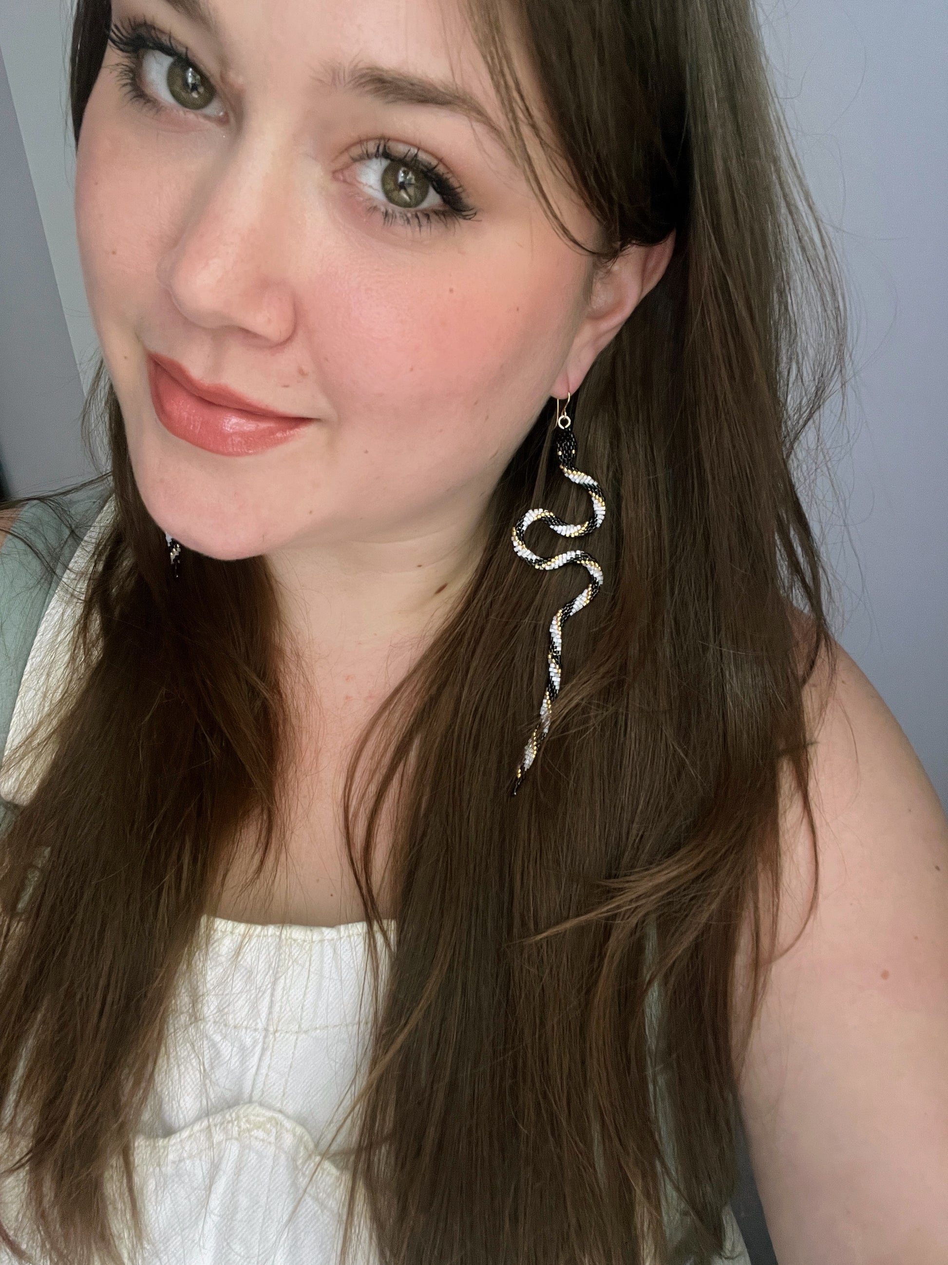 *please note that the modeled earrings are a different pattern, but is used to show the size of the snakes.