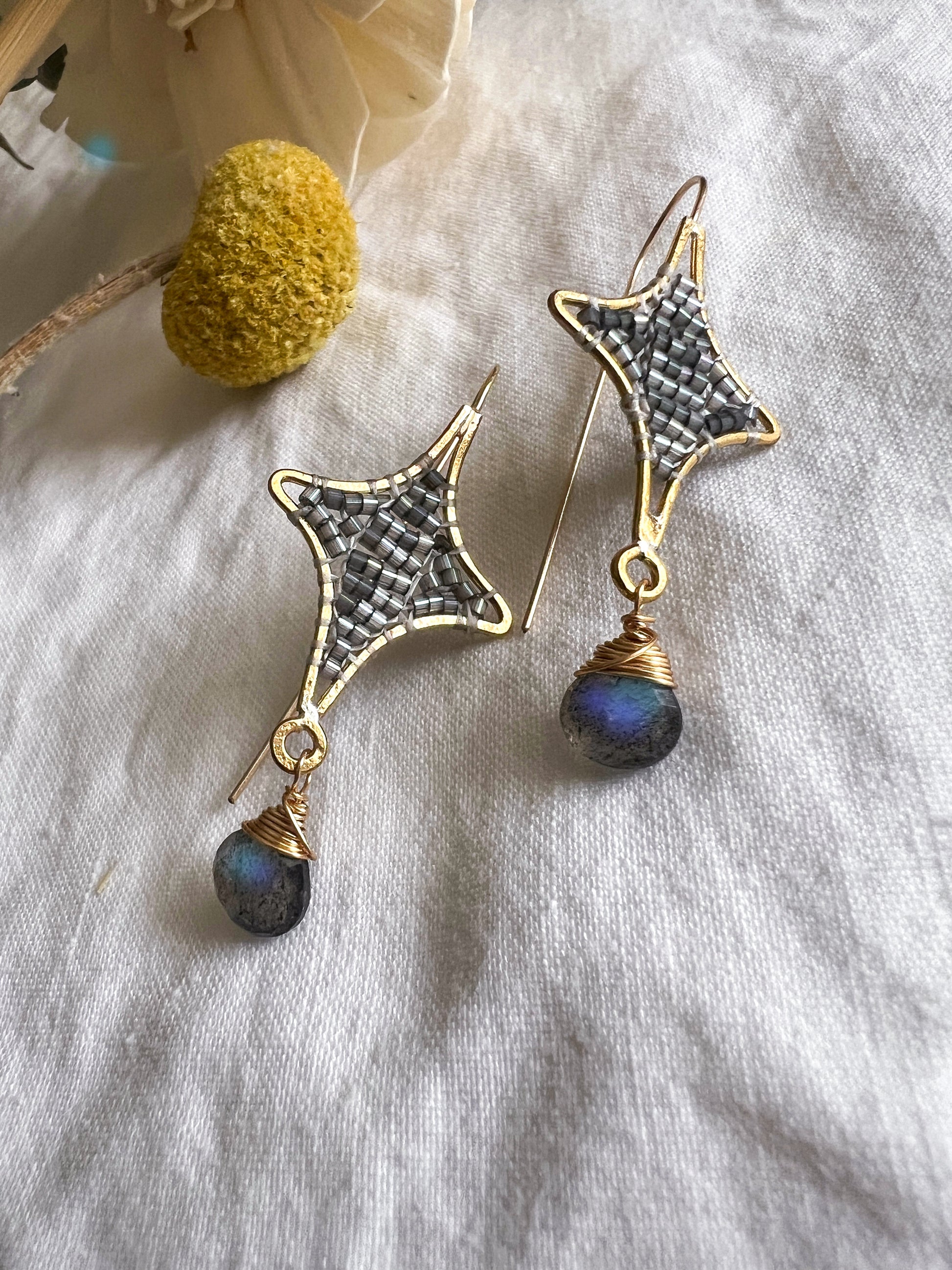 Gold-filled ear wire, brass frame, glass beads, labradorite